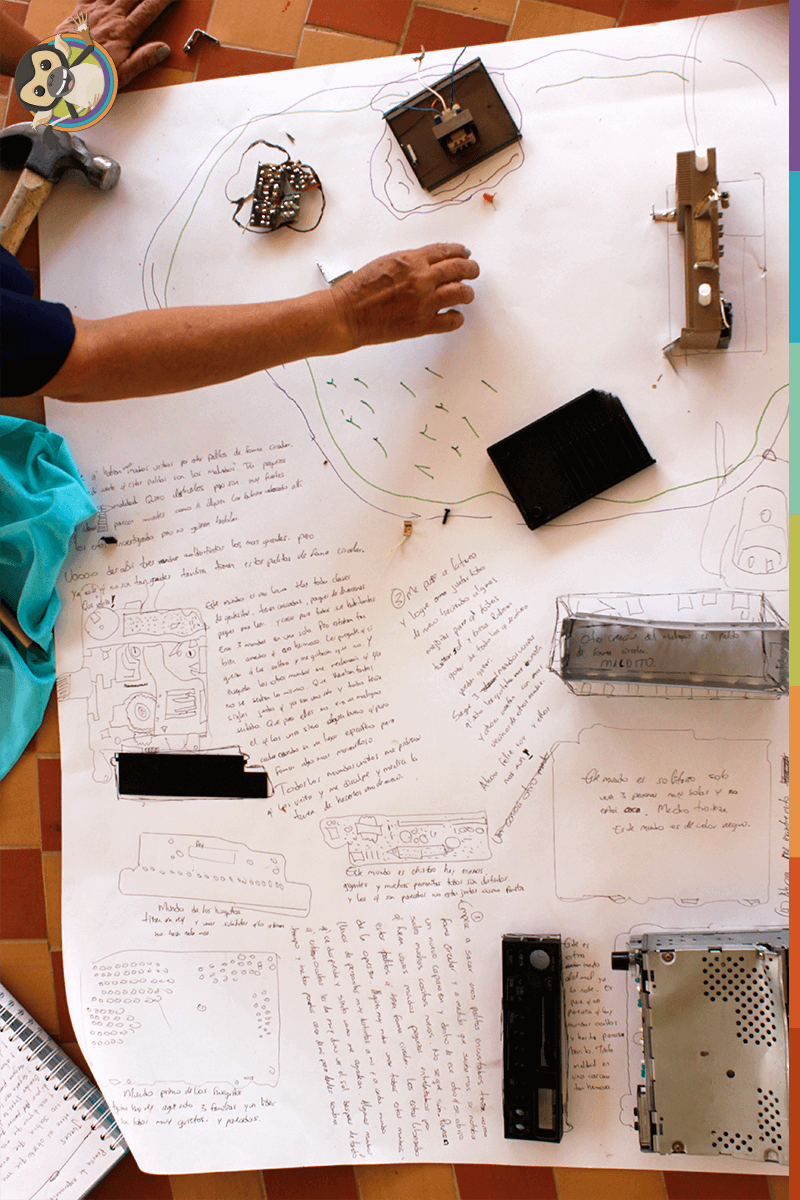 Luego de desarmar el objeto en múltiples piezas, se hace un ejercicio de exhibición de cada una de estas piezas, creando mapas que los niños organizan de manera espontánea ya sea por colores, formas, nombres inventados, etc.