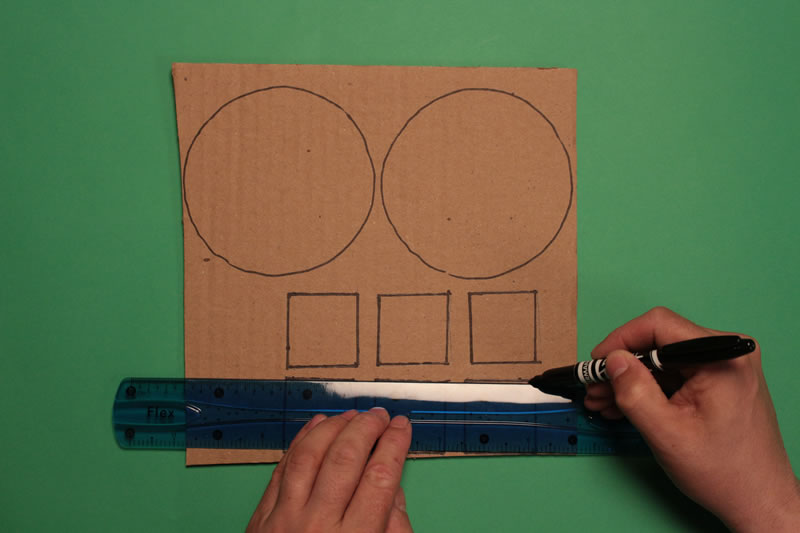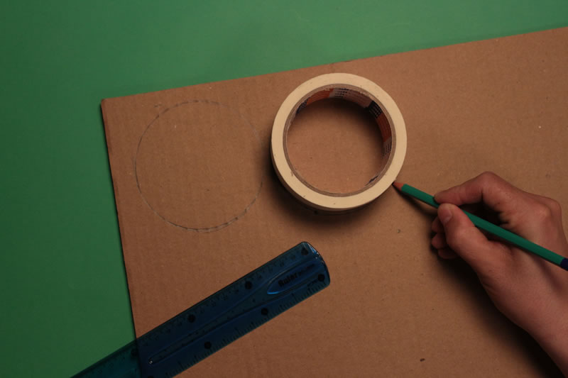 1. En una lámina de cartón dibujen dos círculos de doce centímetros. Pueden utilizar como guía la cinta de enmascarar, una tapa o un frasco que tenga esa dimensión aproximada.