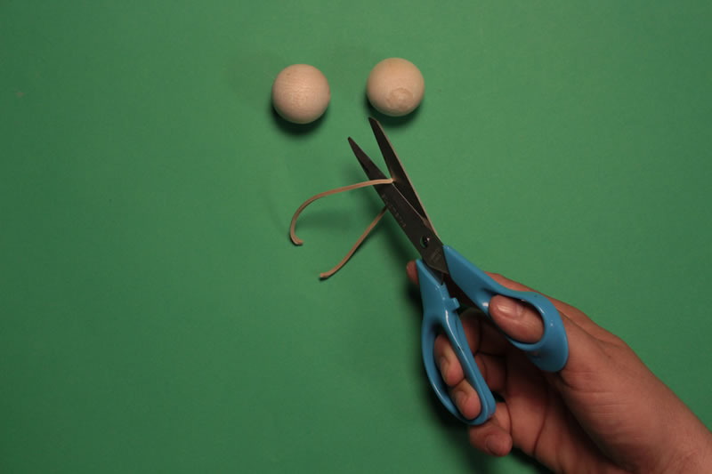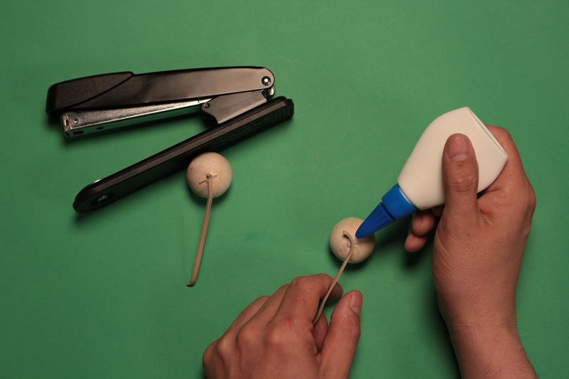 6. Peguen las dos bolitas de madera en cada uno de los extremos de los cauchos. Para reforzar la unión grapen el caucho a las bolitas de madera.