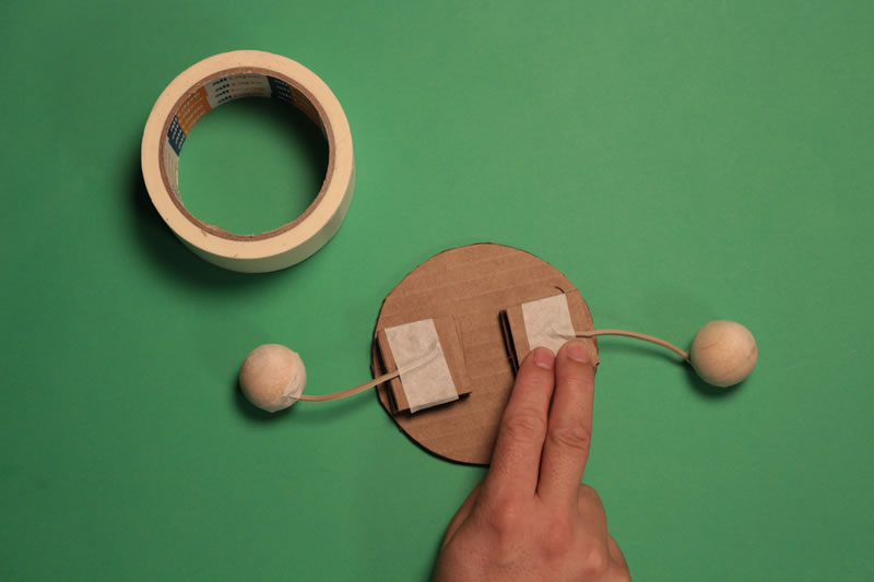 7. Unan los cauchos con bolitas a los cuadrados de cartón; utilicen cinta de enmascarar.
